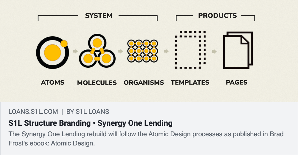 The Synergy One Lending rebuild will follow the Atomic Design processes as published in Brad Frost’s ebook: Atomic Design.